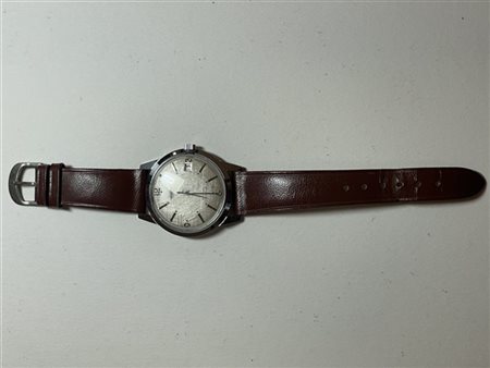 Quadrante argentato con indici e numeri arabi applicati, data ad ore tre