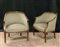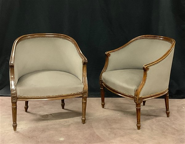 Coppia di poltrone a pozzetto in legno intagliato. Braccioli a ricciolo. Gambe a colonna scanalata (lievi difetti)