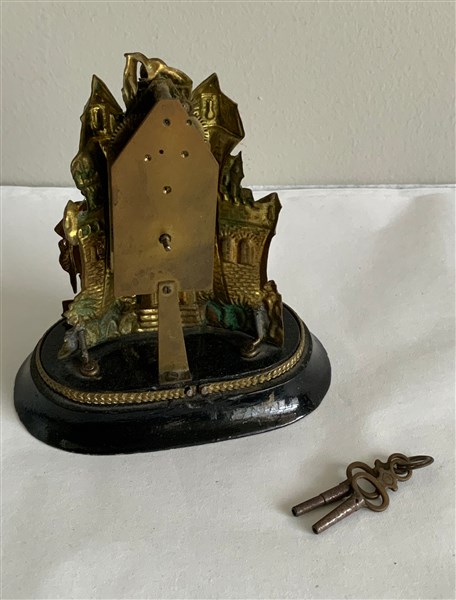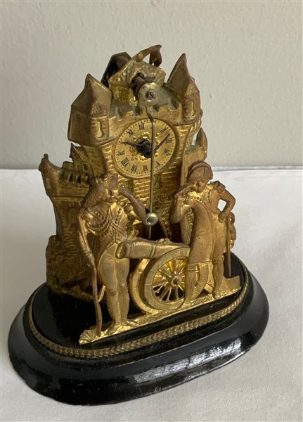 Orologio del tipo "Zappler" in ottone sbalzato a soggetto militare. Austria o Germania del sud, seconda metà del XIX secolo (h cm 10,5) (difetti)