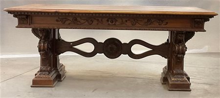 Tavolo in legno scolpito con costegni a girali terminanti a teste zoomorfe, piano rettangolare con fascia intagliata a girali, foglie e fiori (cm 202x85x103) (difetti)