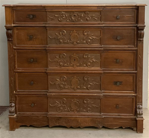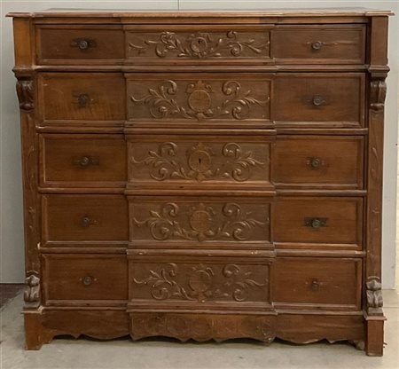 Cassettone in legno intagliato a cinque cassetti con pannelli intagliati a motivi fogliacei. Secolo XIX (cm 131x121x63) (restauri e sostituzioni)
