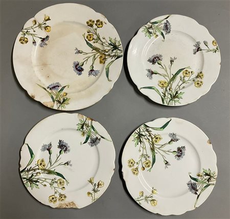 Manifattura Società Ceramiche Richard, quattro piatti della serie "Giugno" in ceramica dipinta con gruppi di fiori. Inizio secolo XX. ((d cm 25 e 21,5)) (difetti)