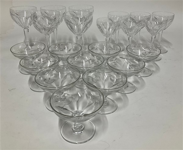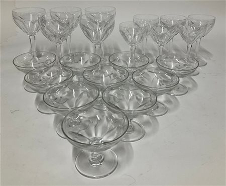 Parte di servizio di bicchieri in cristallo molato composto da cinque calici da acqua, sei calici da vino e dieci coppe da champagne