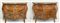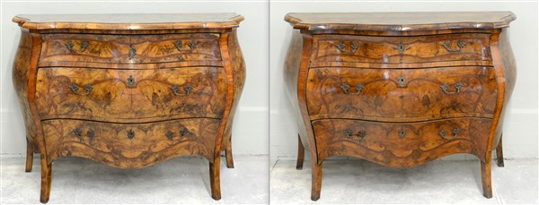 Coppia di comò lombardi a tre cassetti con fianchi e fronte mossi, lastronati e filettati in noce e radica di noce (cm 131x97x53) (difetti e mancanze)