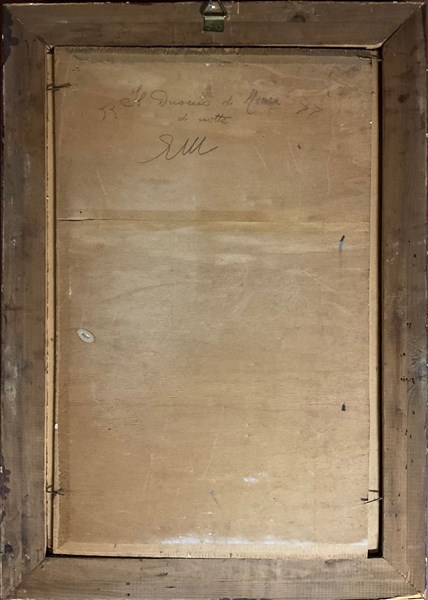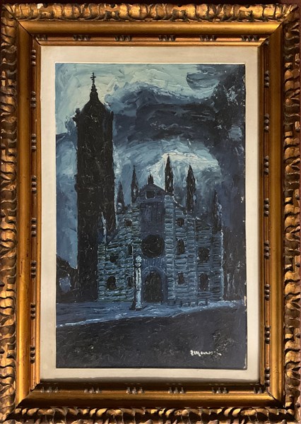 Firma indecifrata "Il Duomo di Monza di notte" olio su tavola (cm 60x38) firmato in basso a destra, titolato e siglato al verso, in cornice