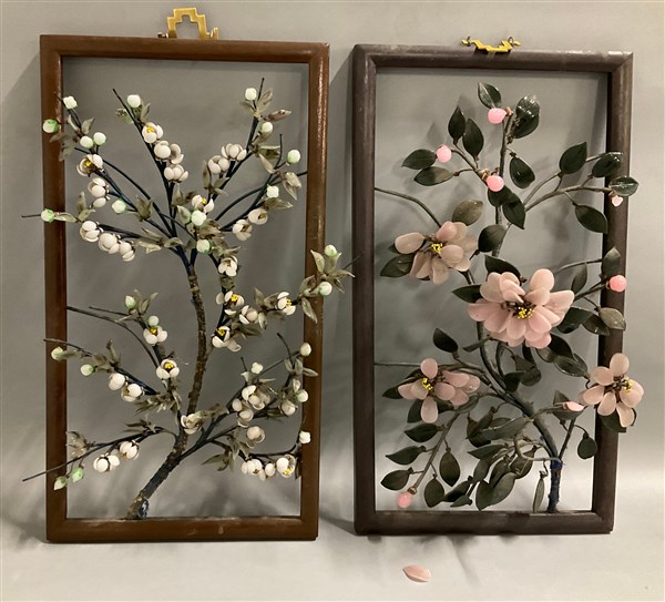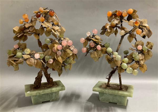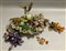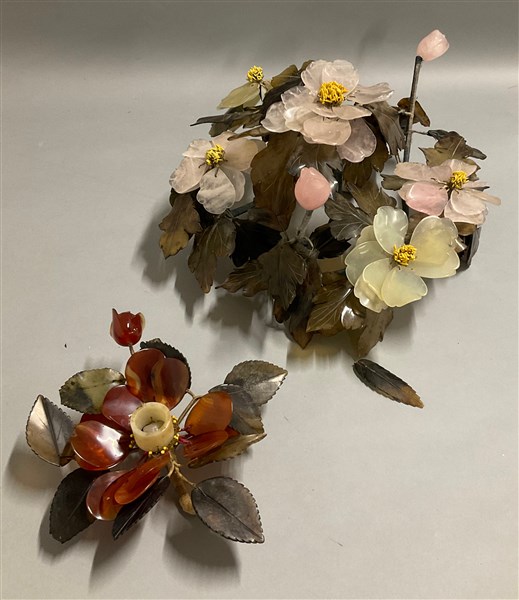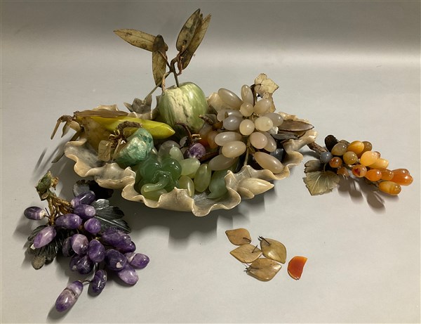 Lotto composto da due alberelli, una ciotola a forma di conchiglia contenente frutti di vario genere, un centrotavola floreale, due pannelli floreali il tutto con pietre dure e di altro genere