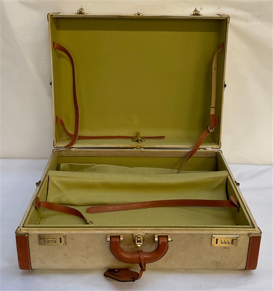 Set di valigie in pergamena con profili in cuoio color tabacco composto da due valigie e un borsone dettagli in metallo color oro (difetti e segni d'uso)