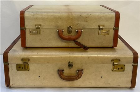 Set di valigie in pergamena con profili in cuoio color tabacco composto da due