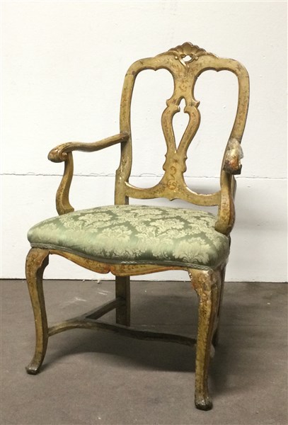 Poltrona in legno intagliato laccato e dorato, dipinta a motivi floreali, regi e insetti. Schienale traforato, gambe e braccioli mossi. Veneto sec. XVIII (difetti e restauri)
