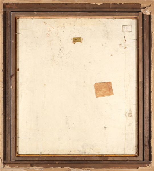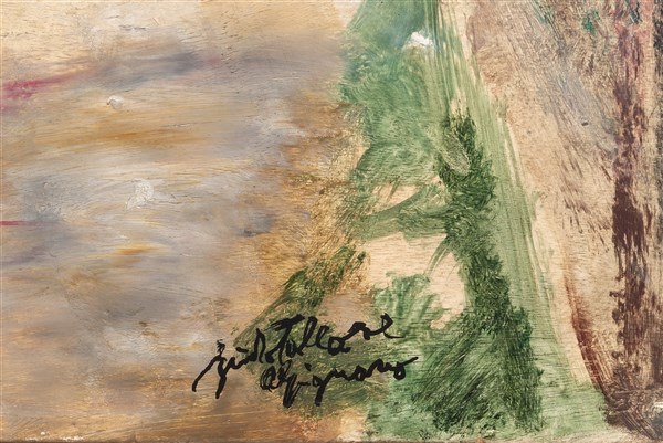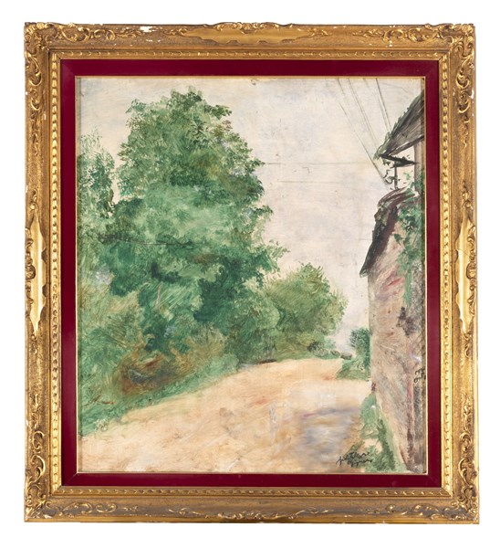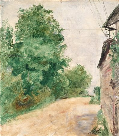 "Alpignano. Strada di paese" olio su compensato (cm 70x60) Firmato e locato in basso a destra. Al retro: cartiglio della Galleria Pesaro, Milano. In cornice (difetti)