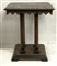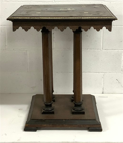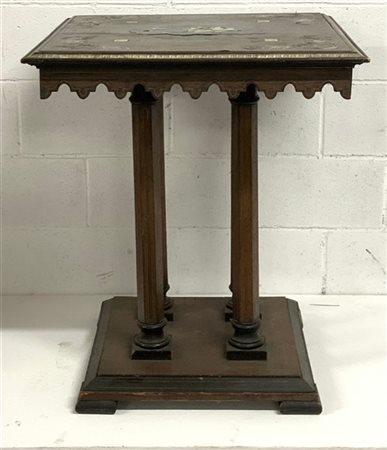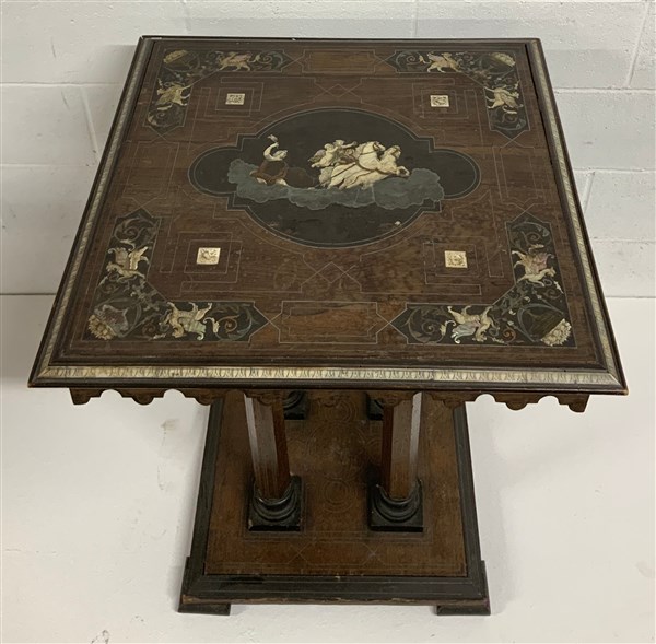 Tavolino quadrato in legno filettato in peltro, piano decorato al centro e ai lati da riserve ebanizzate intarsiate in avorio, madreperla e metallo con scena mitologica, animali fantastici, vasi fioriti e volute. Sostegno a quattro colonne con capitelli e basi ebanizzate poggianti su base squadrata, Lombardia secolo XIX (cm 67x80x67) (difetti e mancanze)
