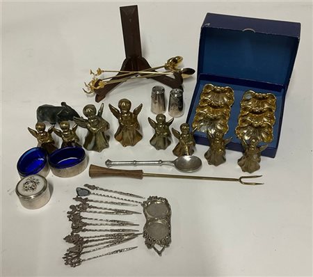 Lotto composto da numerosi oggetti tra cui piccole sculture, salierine, piccole posate da antipasto e numerosi altri oggetti in metallo, argento e materiali vari (difetti)