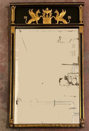 Caminiera in legno ebanizzato intagliato e dorato. Cimasa centrata da vaso con due grifoni (lievi difetti) (cm 88x138)