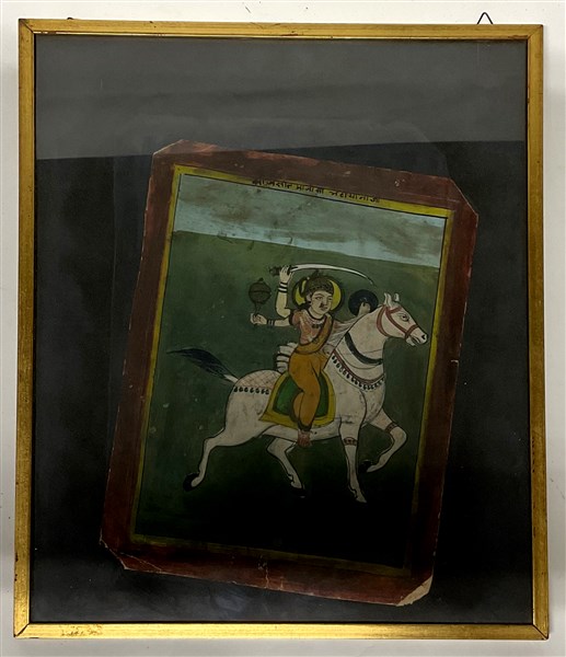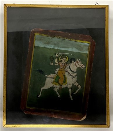 Pagina illustrata a tempera e china su carta recante inscrizione e raffigurante guerriero a cavallo. India, secolo XIX. In cornice (cm 31xx22,5) (difetti)