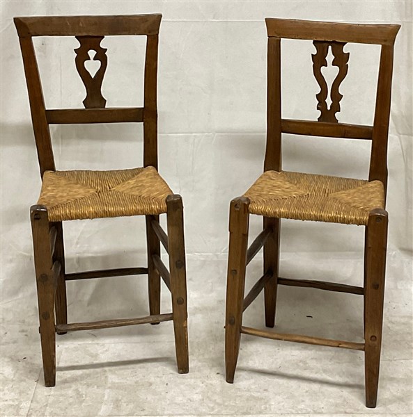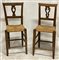 Lotto di due sedie in legno con schienale a giorno intagliato, seduta in paglia