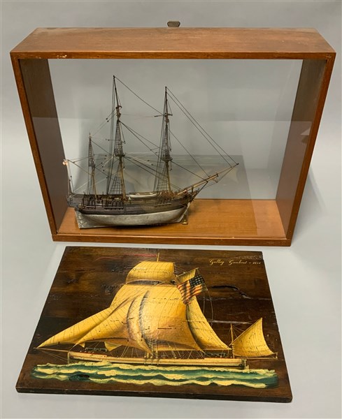 Lotto composto da un modellino di veliero contenuto in teca (cm teca 50x38x15) e un dipinto su tavola raffigurante un veliero americano (cm 32x40) (difetti)