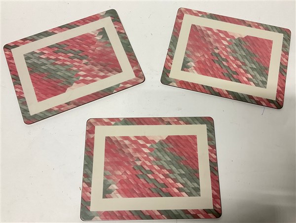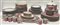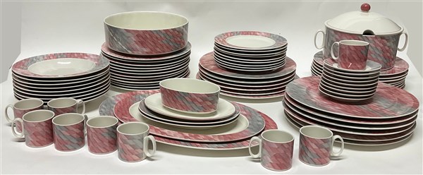 Manifattura Villeroy &Boch. Parte di servizio da tavola in porcellana con fascia decorata nei toni del rosa composto da undici sottopiatti, venti piatti piani, nove piatti fondi, nove piattini da dolce, una zuppiera biansata con coperchio, un'insalatiera, un piatto circolare da portata, quattro vassoi di diverse misure, una salsiera, nove tazzine, nove piattini e tre sottopentola in sughero (lievi difetti)