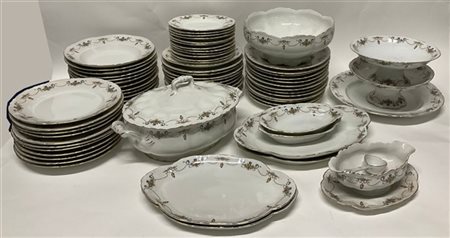 Manifattura Richard Ginori. Parte di servizio da tavola in porcellana bianca con bordo mosso dorato decorato in policromia a cesti di foglie e frutti tra volute. Composto da trentacinque piatti piani, dodici piatti fondi, dodici piatti da dolce, un piatto circolare da portata, quattro vassoi di diverse misure, una zuppiera biansata con coperchio, un'insalatiera, due alzate, una salsiera con cucchiaio e due antipastiere (difetti)