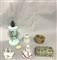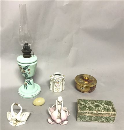 Manifatture diverse, lotto composto da una scatola in ceramica decorata in policromia a fiori, una lampada ad olio, due sculturine, una scatola rotonda con coperchio, un uovo in pietra dura e un contenitore (difetti)