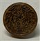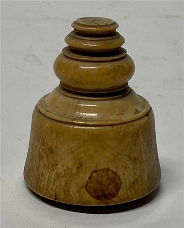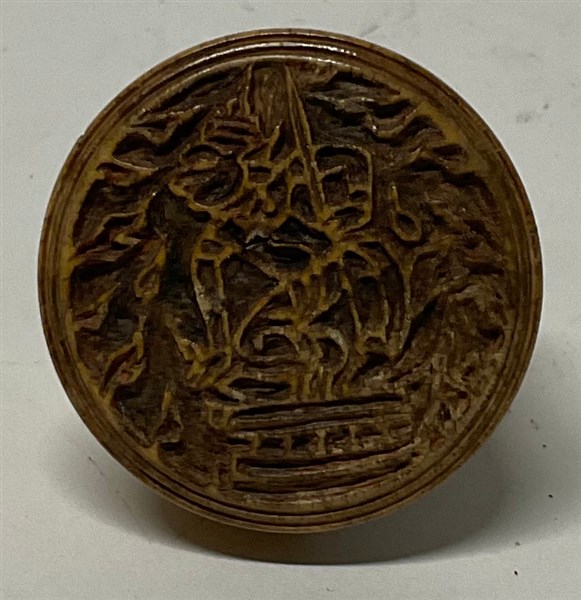 Sigillo in osso intagliato con figura di divinità, presa tornita Arte del Sud Est Asiatico, inizio sec. XX (h. cm 5,5)