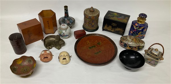 Manifattura orientale. Cartone contenente numeraosi oggettti e contenitori in legno, caramica ed altri materiali (difetti)
