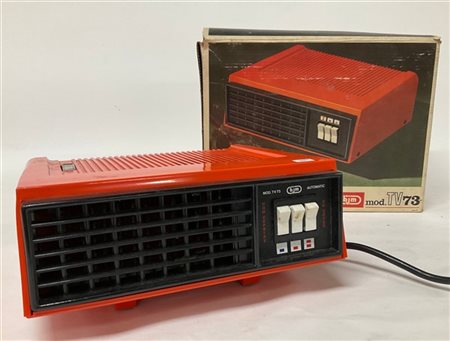 Termoventilatore modello "TV75". Milano, anni '60. Plastica rossa e nera. In scatola originale. (lievi difetti)