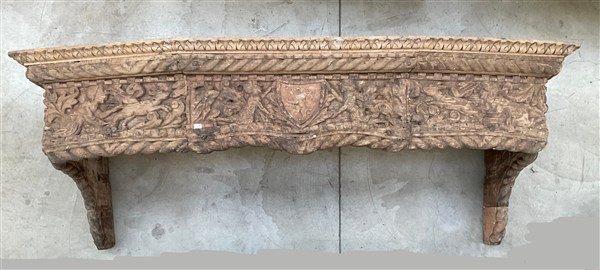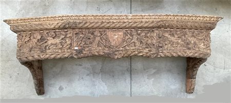 Copricamino in rovere interamente scolpito a volute e foglie decorato al centro da stemma nobiliare. Secolo XIX (cm 180x64x66) (difetti)