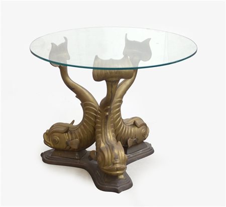 Tavolino basso con base in ottone raffigurante tre carpe e piano tondo in vetro, anni 70 (cm 60x48).