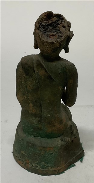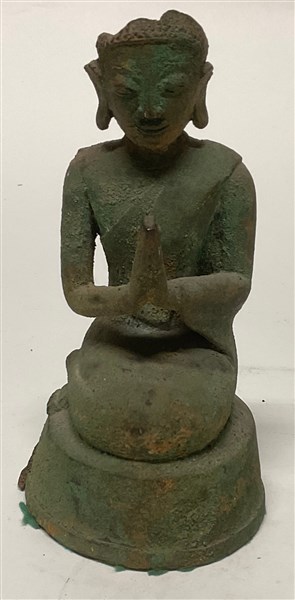 Arte orientale. Antica scultura in bronzo raffigurante Budda seduto in preghiera (h. cm 19) (difetti)
