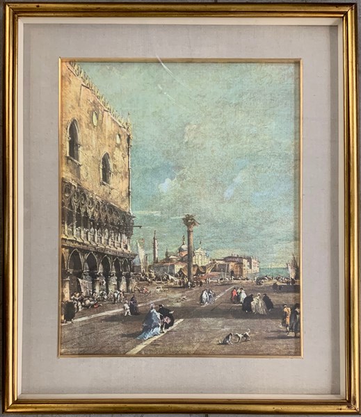 Lotto composto da due incisioni a colori, una riproduzione raffigurante scorcio di Venezia, in cornici unite ad un dipinto Batik. Misure diverse (difetti)