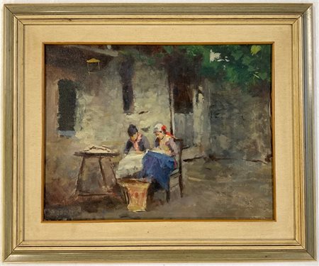 Uberto Dell' Orto "In cortile" olio su tela applicata a cartone (cm 44x55) In co