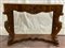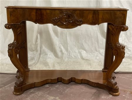 Consolle di forma mossa lastronata con fascia decorata da fregio, gambe anteriori intagliate a volute e fiori poggianti su ripiano sagomato (cm 130x93x58) (difetti e restauri)