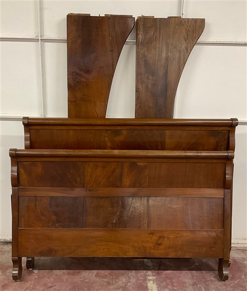 Letto a due piazze in mogano, montanti decorati da elementi in legno ebanizzato (largh. cm 153) (difetti)