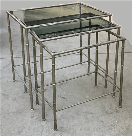 Gruppo di tre tavolini a nido in metallo a finto bamboo con piano in vetro (cm 56x50x40) (difetti)