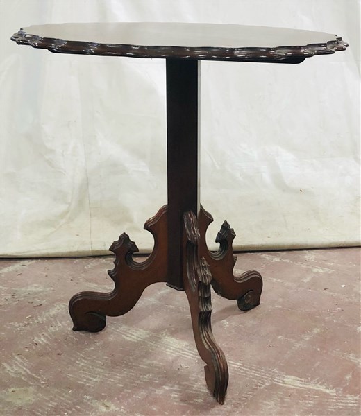 Tavolino con piano circolare a vela a bordo smussato, gamba sfaccettata a tre piedi sagomati. Secolo XIX (d. cm 70xh. 72) (difetti)