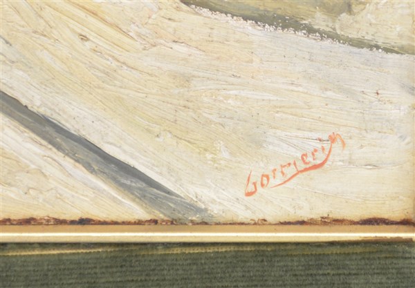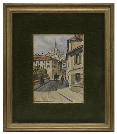 Firma indecifrata "Scorcio di Milano con Duomo" olio su cartone telato (cm 40x30) firmato in basso a destra. Al retro: iscrizione. In cornice