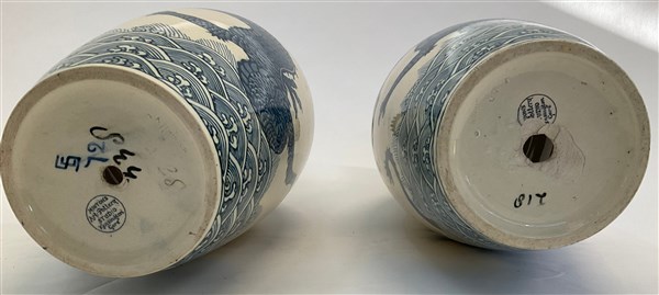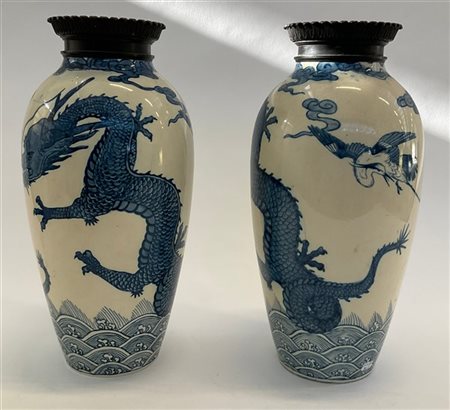 Manifattura Minton's Art Pottery Studio, Kensington Gore - Coppia di basi per lampade in ceramica smaltata blu e bianca a motivi orientali, ghiere in bronzo (h cm 37) (lievi difetti)