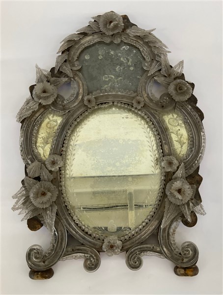 Specchiera di forma mossa decorata da applicazioni in vetro a fiori, volute e perlinature. Murano, inizio secolo XX (cm 44x70) (difetti e mancanze)
