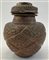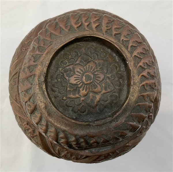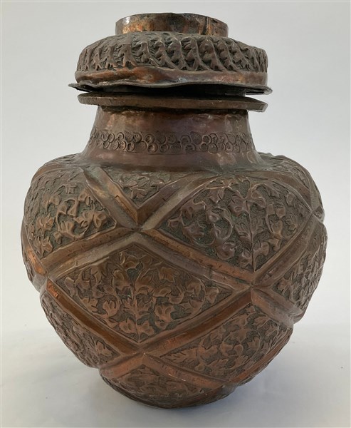 Manifattura asiatica, vaso con coperchio in rame sbalzato a losanghe e motivi floreali (h cm 28) (difetti)