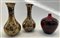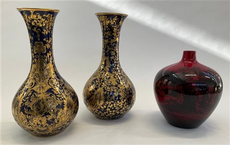 Lotto composto da una coppia di vasi in porcellana dipinta a ramages oro su fondo blu e un vaso in ceramica Royal Doulton con scena di caccia su fondo rosso (h cm 32 e 23) (difetti)
