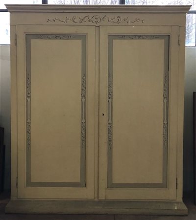 Armadio a due ante in legno laccato e decorato a volute fogliate. Inizio XIX secolo (cm 200x240x49,5) (difetti)