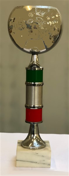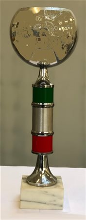 Coppa trofeo in metallo con sostegno tornito tricolore e base quadrata in marmo