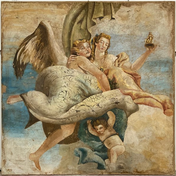 Ignoto, antico dipinto raffigurante una derivazione da Tiepolo intitolata "Trionfo della nobilità e della virtù sull'ignoranza", strappo d'affresco (cm 150x150) (difetti)
