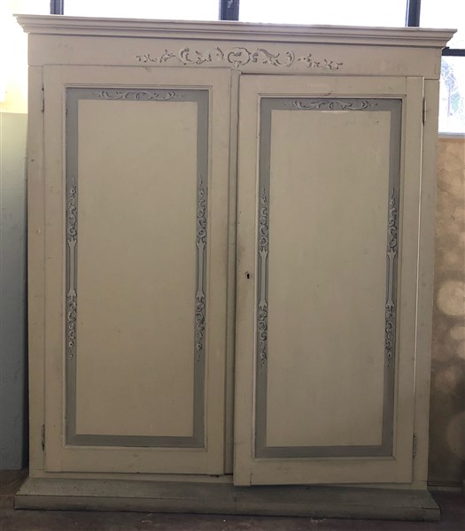 Armadio a due ante in legno laccato e decorato a volute fogliate. Inizio XIX secolo (cm 200x240x49,5) (difetti)