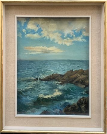 "Marina con scogli" olio su cartone telato (cm 40x30) Al retro: firmato. In cornice