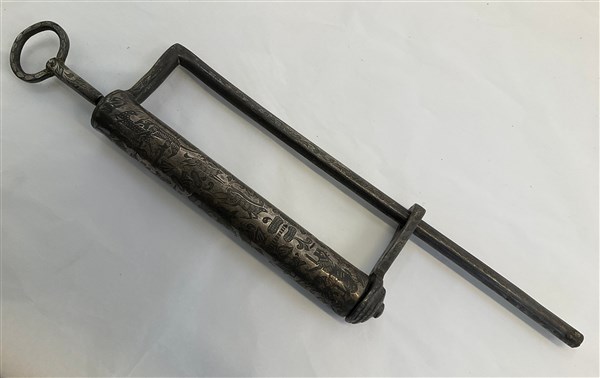 Manifattura persiana, chiavistello in metallo argentato decorato con animali e fiori (l cm 42) (lievi difetti)