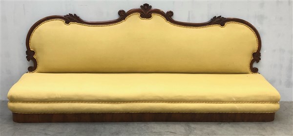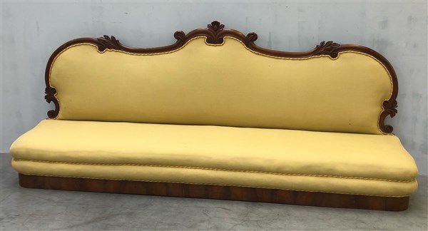 Coppia di divani in legno lastronato. Schienale sagomato e intagliato a volute fogliate e riccioli. Veneto, secolo XIX (cm 320x60x113) (difetti)