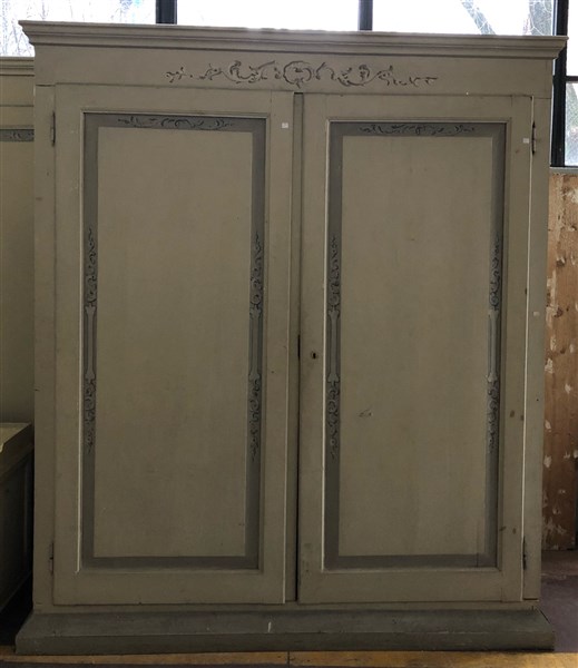 Armadio a due ante in legno laccato e decorato a volute fogliate. Inizio XIX secolo (cm 200x240x49,5) (difetti)