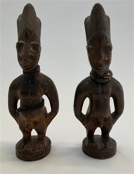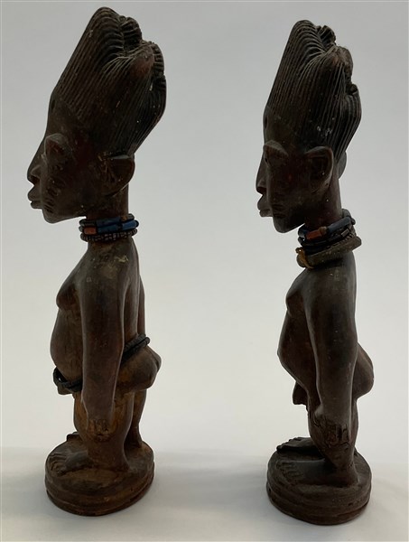 Arte africana, lotto di due sculture in legno raffiguranti nudi maschili con collanine (h cm (difetti)