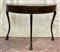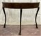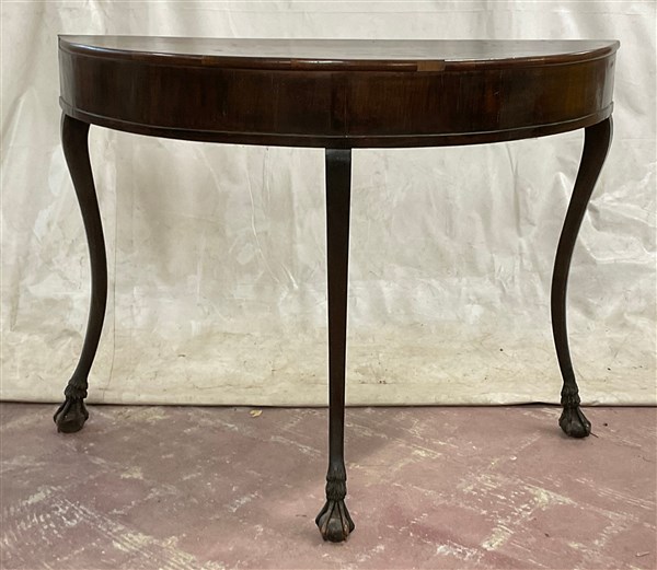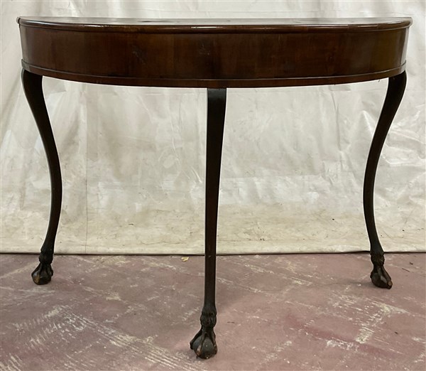 Coppia di consolle demi-lune lastronate in mogano, gambe mosse terminanti ad artiglio su sfera. Veneto, secolo XVIII (cm 114x85x48,5) (difetti e restauri)